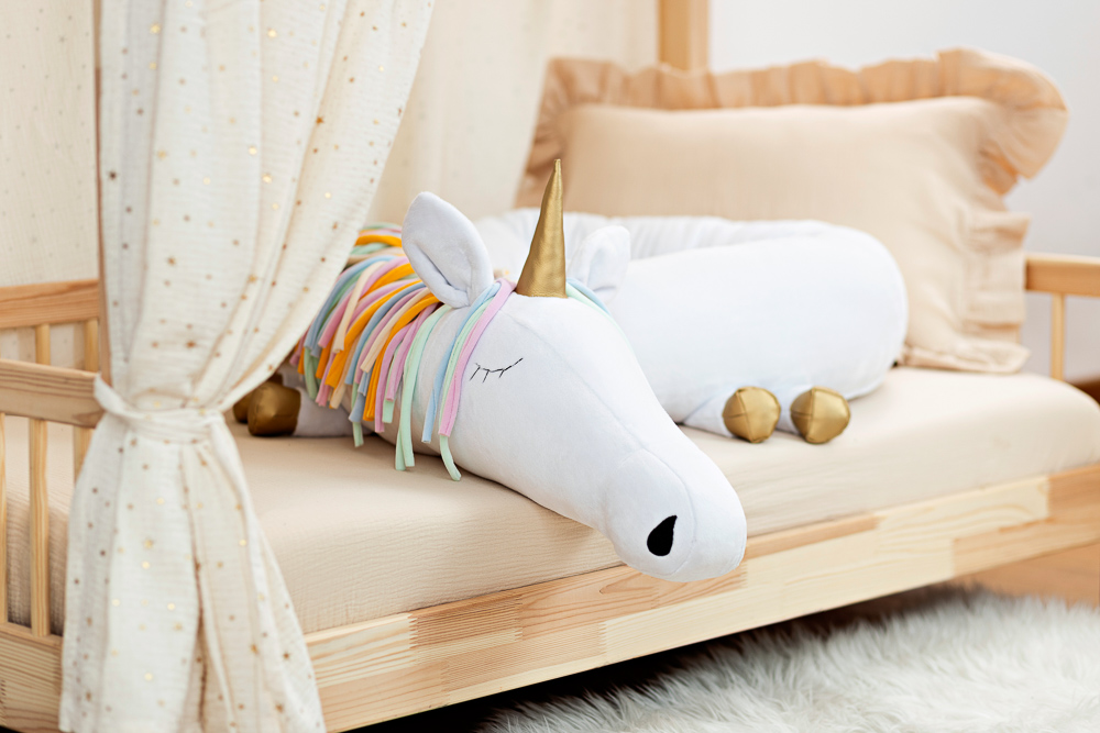 Dieses weiße Einhorn mit Regenbogenmähne und goldenen Akzenten begeistert Kinder und Eltern gleichermaßen. Seine Flügel, sein Horn und seine Hufe verleihen ihm eine magische Note. Das lange Nackenkissen ist aus OEKO-TEX-zertifizierten Stoffen handgenäht und schützt und schmückt perfekt das Kinderbett. Außenmaterial und Füllung sind nach Öko-Tex Standard 100 zertifiziert. Das Produkt selbst ist CE-gekennzeichnet (erfüllt die Anforderungen der Spielzeugrichtlinie 2009/48/EG) – Konformität mit der Norm EN 71-1 (Mechanische und physikalische Eigenschaften – Sicherheit von Spielzeug für Kinder unter 36 Monaten) und EN 71-2 (Entflammbarkeit – Sicherheit von Spielzeug für Kinder unter 36 Monaten). Zusammensetzung: Außenschicht: Minky 100 % PES (Öko-Tex Standard 100 zertifiziert) Füllung: hypoallergener Silikonball (Öko-Tex Standard 100 zertifiziert) Maße: Länge: 250 cm, Breite: 15 cm, Höhe: 15 cm Gewicht: 3 kg