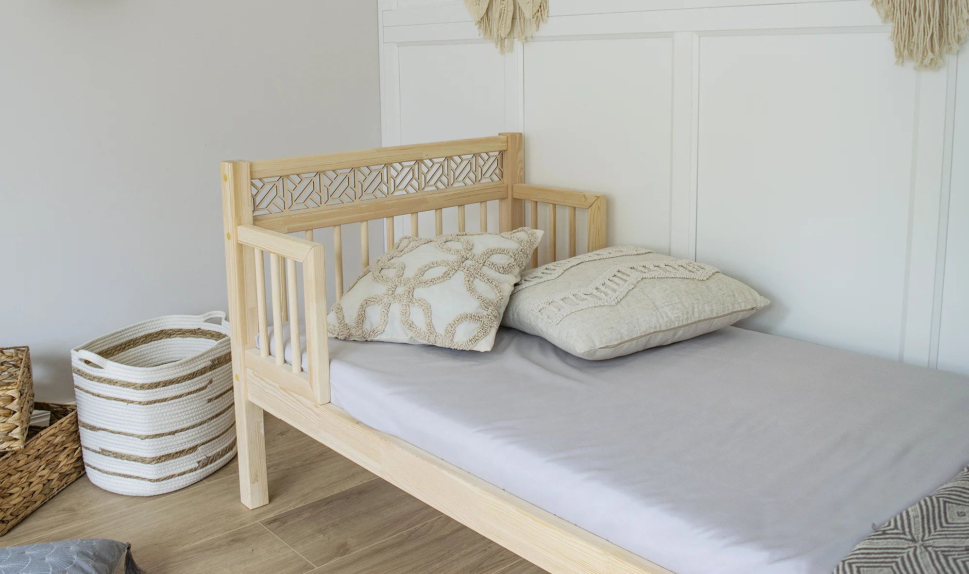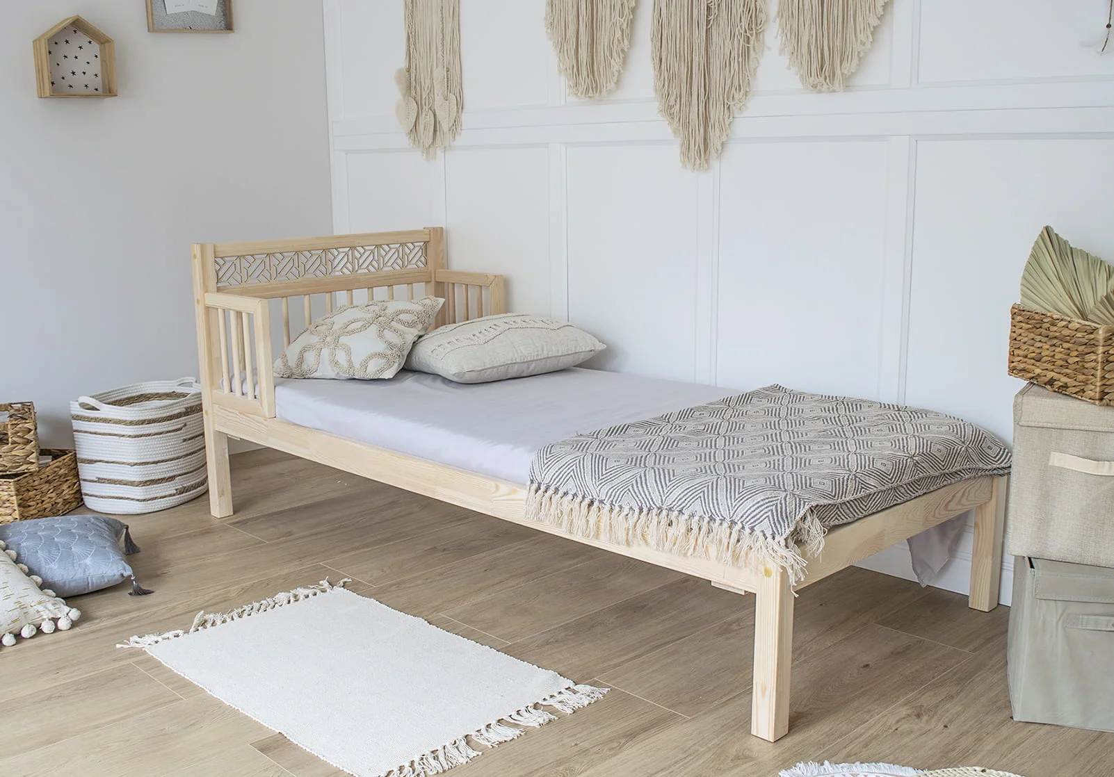 Die hohe Kopfstützenschiene mit Ornament ist 43 cm hoch und bietet ausreichend Halt für das Kissen/den Kopf, die kurzen Seitenschienen sind 31 cm hoch und können später demontiert (entfernt) werden.