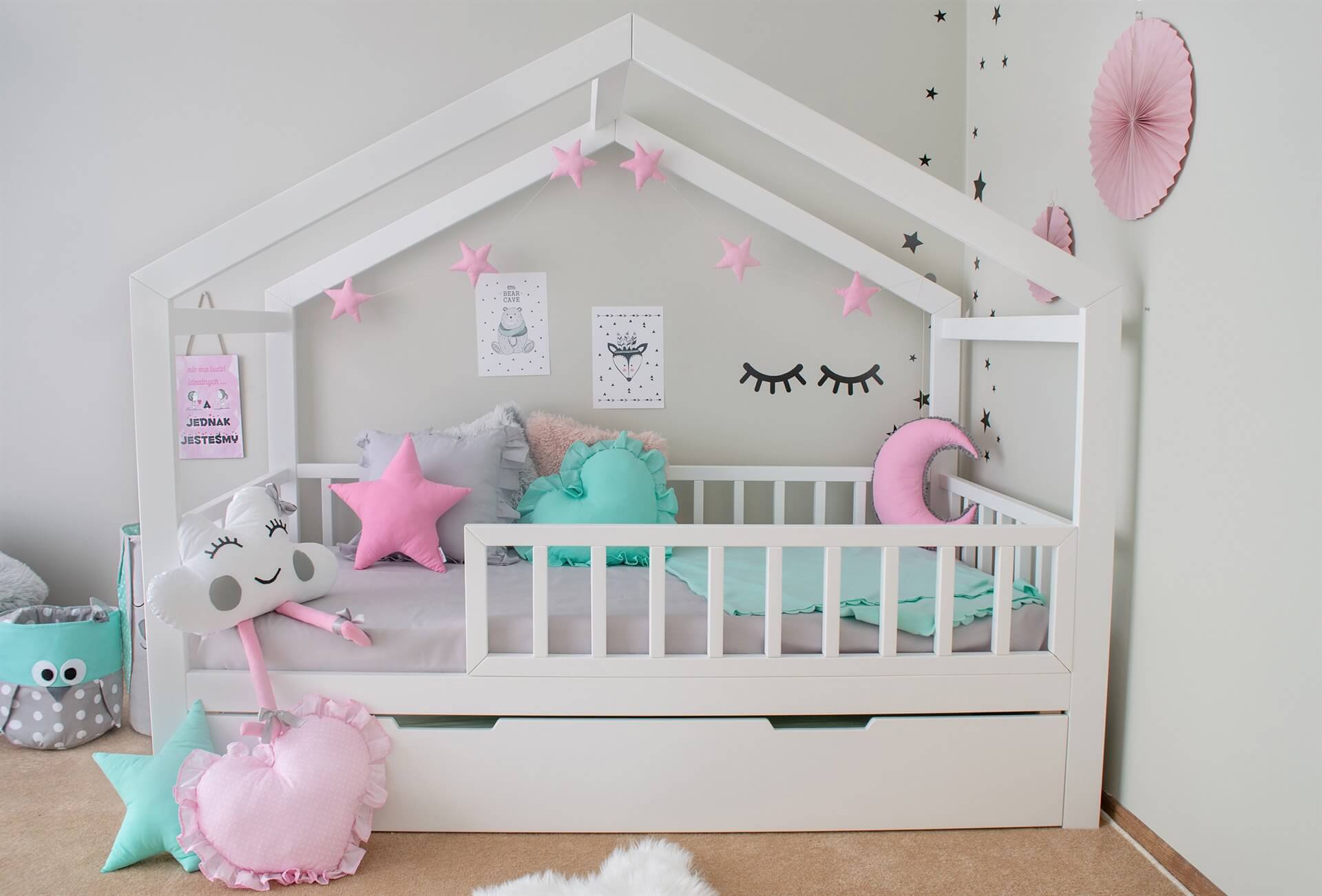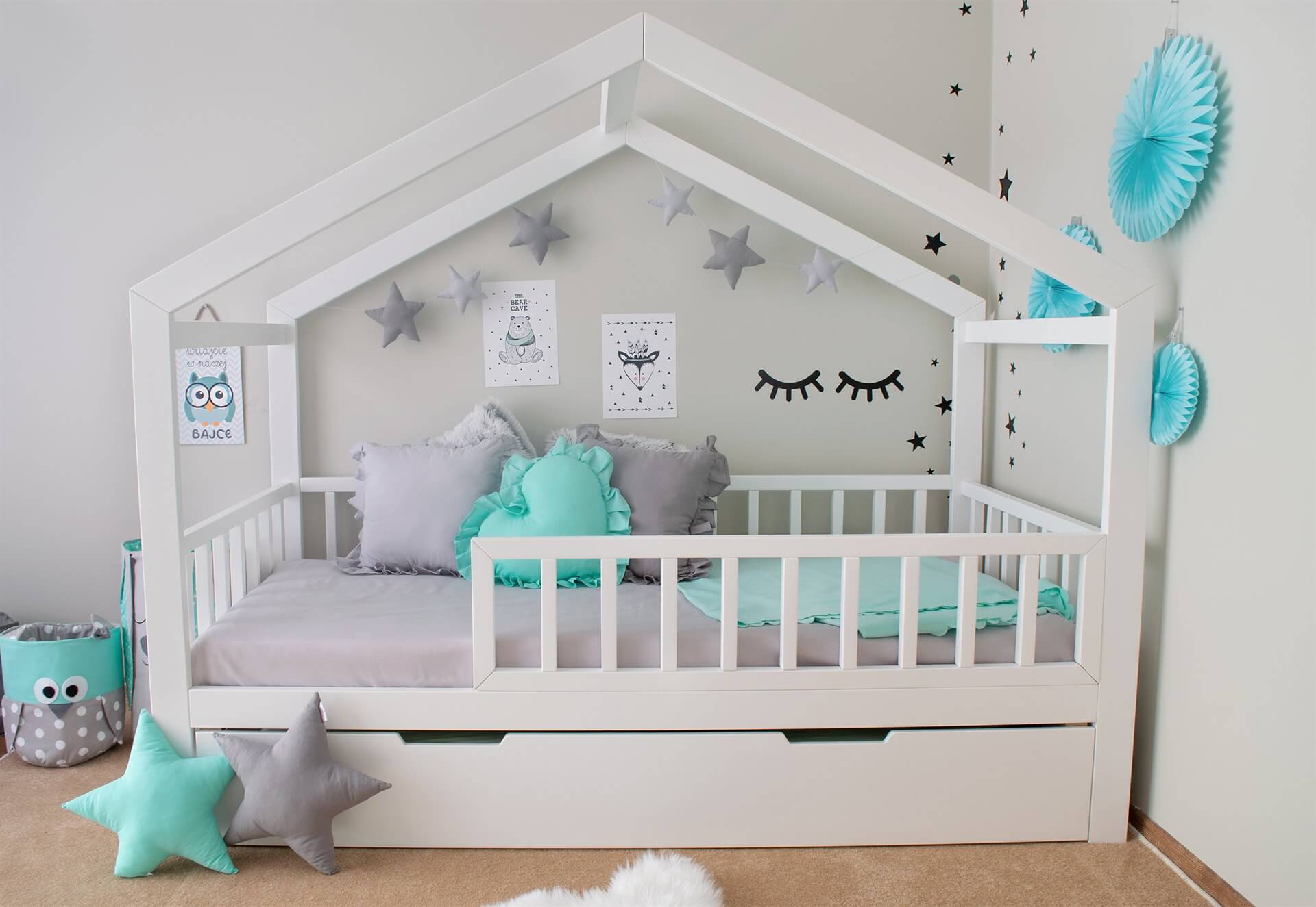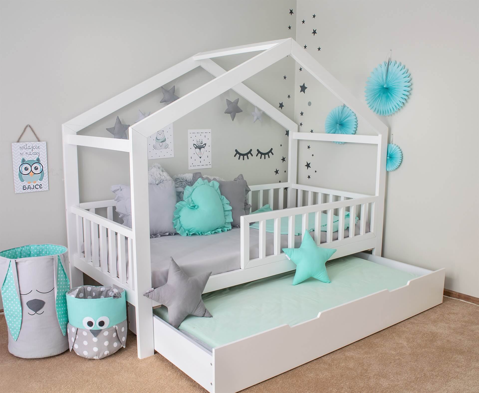 Hausbett Mireli mit Schublade ist ein hochwertiges Bett im skandinavischen Stil – Das Bett wird aus massivem, hochwertigem Kiefernkantholz hergestellt.