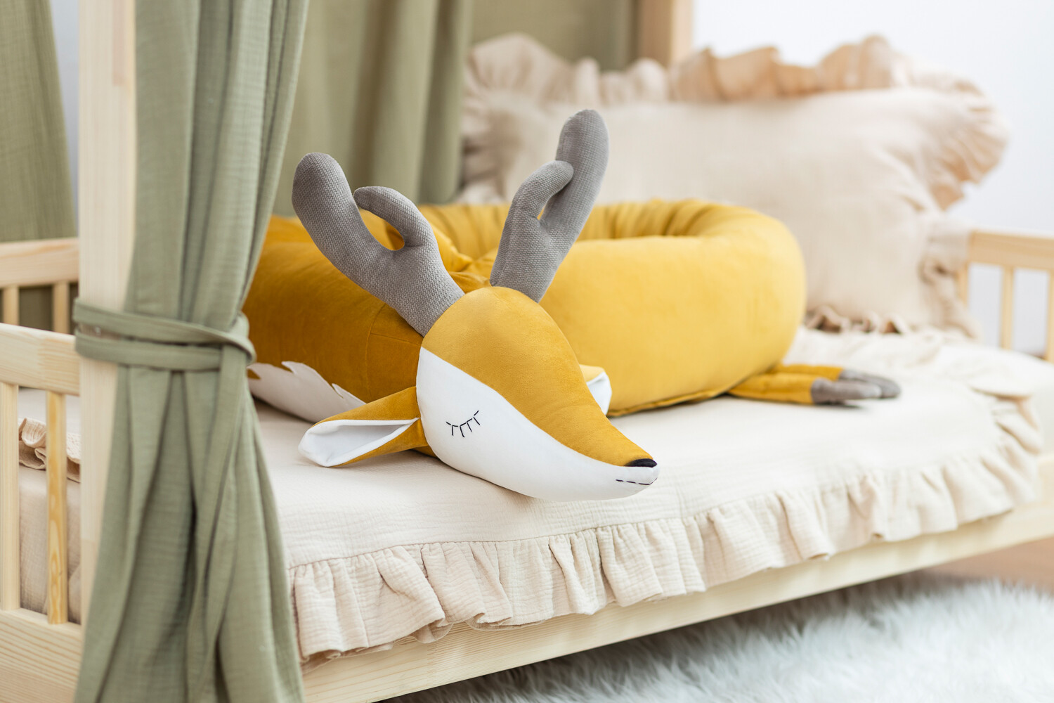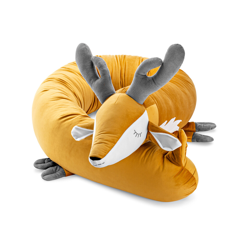 Dieses bezaubernde Rehkitz mit weicher Schnauze und Plüschgeweih lädt zu Waldabenteuern ein! Dieses Kissen ist auf Komfort ausgelegt – ideal zum Schlafen, Spielen und Kuscheln. Es sieht wunderschön aus im Kinderzimmer, besonders im Natur- oder Boho-Stil. Das Rehkitz ist nicht nur eine Dekoration, sondern auch ein treuer Begleiter für jedes Kind. Das Außenmaterial wurde vom Hersteller auf Migration chemischer Elemente geprüft (Einhaltung der Norm EN 71-3, die Füllung ist ÖkoTex Standard 100 zertifiziert. Das Produkt selbst ist CE-gekennzeichnet – Einhaltung der Norm EN 71-1 (Mechanische und physikalische Eigenschaften – Sicherheit von Spielzeug für Kinder unter 36 Monaten) und EN 71-2 (Entflammbarkeit – Sicherheit von Spielzeug für Kinder unter 36 Monaten), sowie Einhaltung der Norm EN 71-3 Chemische Sicherheit von Spielzeug) Zusammensetzung: Außenschicht: 100 % Samt Füllung: hypoallergener Silikonball (ÖkoTex Standard 100 zertifiziert) Maße: Länge: 210 cm, Breite: 16 cm, Höhe: 16 cm Gewicht: 3 kg