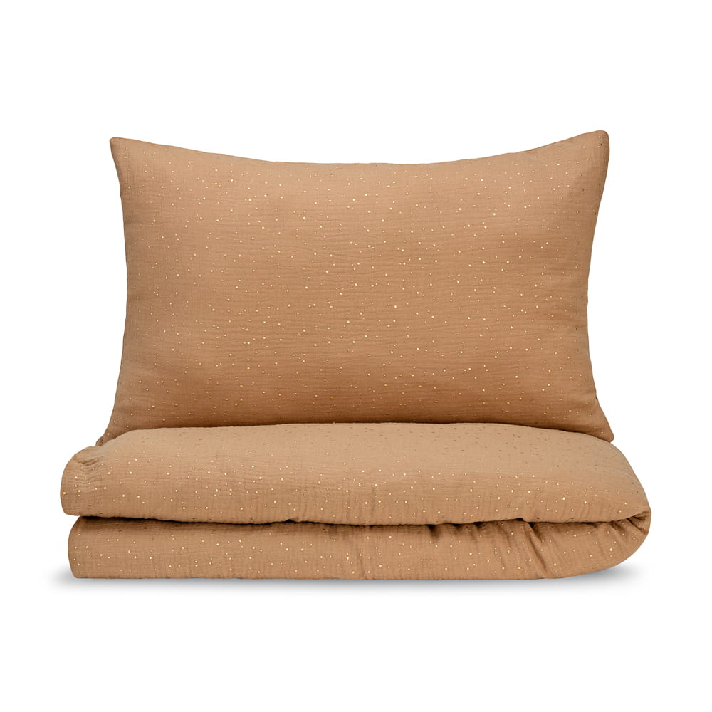 Dieses stilvolle kaffeebraune Bettwäscheset mit goldenen Punkten vereint Eleganz mit Funktionalität. Weicher Musselin-Baumwollstoff sorgt für Atmungsaktivität und Komfort. Ein verdeckter Reißverschluss erleichtert die Handhabung, und der Verzicht auf Füllung ermöglicht Flexibilität bei der Bettdeckenwahl. Perfekt für ein Kinderzimmer mit Charakter. Zusammensetzung: 100 % CO2-freier Baumwollmusselin. Sicherheit: Musselinstoff ist ÖkoTex Standard 100 und GOTS zertifiziert.