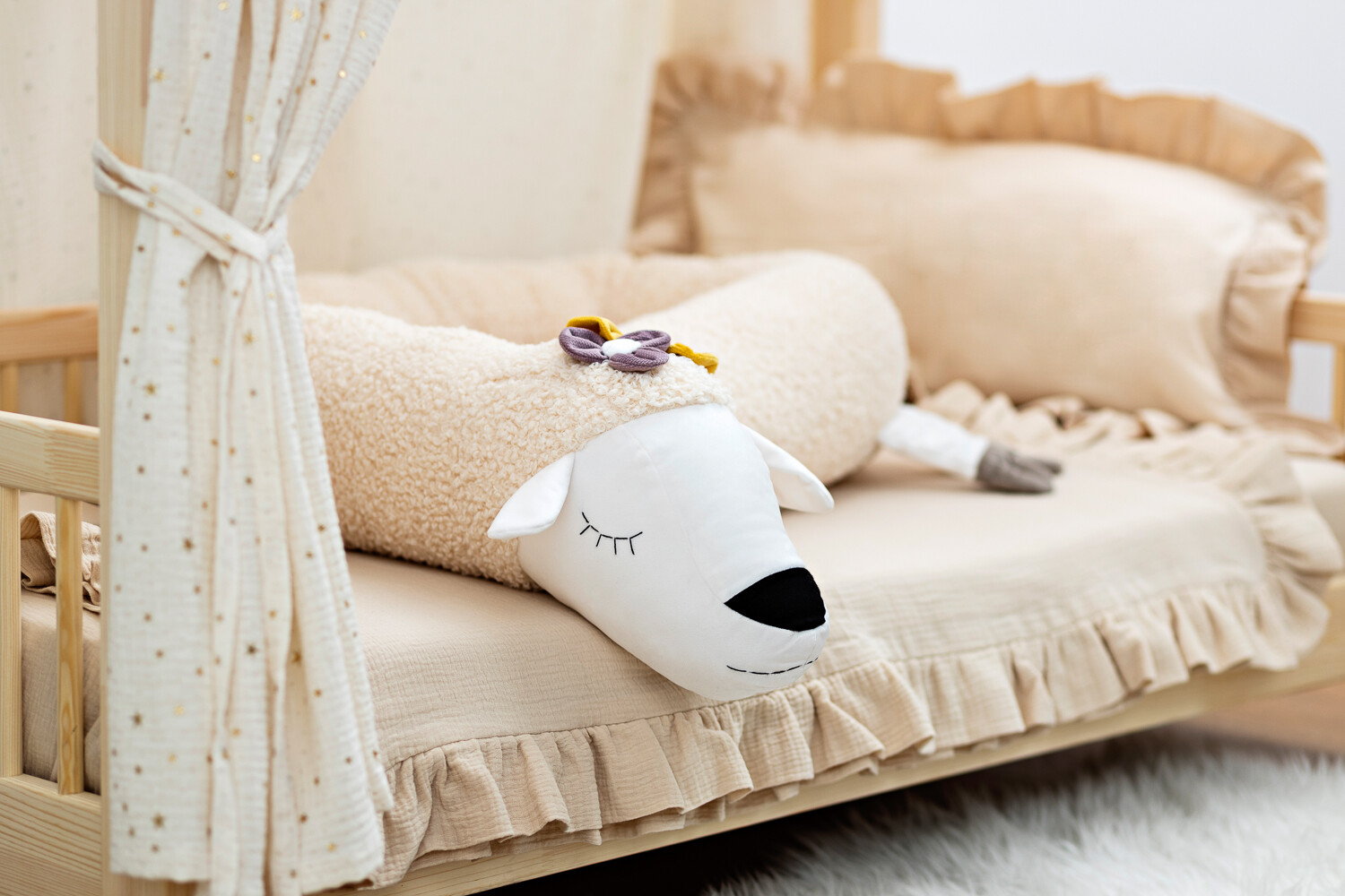 Dieses Schafkissen mit einem bezaubernden Blumenkranz verleiht jedem Kinderzimmer einen märchenhaften Charme. Weich und leicht – perfekt zum Kuscheln und als Bettdekoration. Die Blumen auf dem Kopf verleihen eine einzigartige, mädchenhafte Note. Ein perfektes Geschenk für jeden kleinen Träumer. Das Außenmaterial und die Füllung sind nach Öko-Tex Standard 100 zertifiziert. Das Produkt selbst ist CE-gekennzeichnet – Konformität mit der Norm EN 71-1 (Mechanische und physikalische Eigenschaften – Sicherheit von Spielzeug für Kinder unter 36 Monaten) und EN 71-2 (Entflammbarkeit – Sicherheit von Spielzeug für Kinder unter 36 Monaten). Zusammensetzung: Außenschicht: 100 % PES-Bouclé (Öko-Tex Standard 100 zertifiziert) Füllung: hypoallergener Silikonball (Öko-Tex Standard 100 zertifiziert) Maße: Länge: 200 cm, Breite: 15 cm, Höhe: 15 cm Gewicht: 3 kg